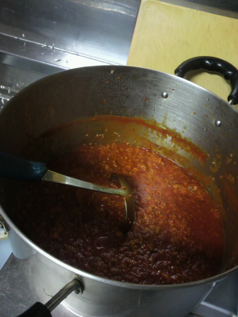 * あとは飛んでくる赤い液体と格闘しながらぐるぐる混ぜて煮詰める。