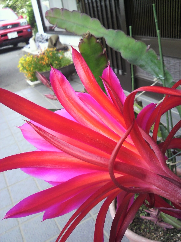 今はもう花(その1)は落ちてしまったんですが、玄関先のクジャクサボテンが花を咲かせました。