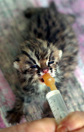 インド北東部ガウハティの動物園で哺乳器をくわえる生後1週間のヤマネコの赤ちゃん。森で発見された。住民の自然に対する認識不足から、野生動物の赤ちゃんが森から連れ出されることもしばしばあるという(Yahoo!ニュースより抜粋)