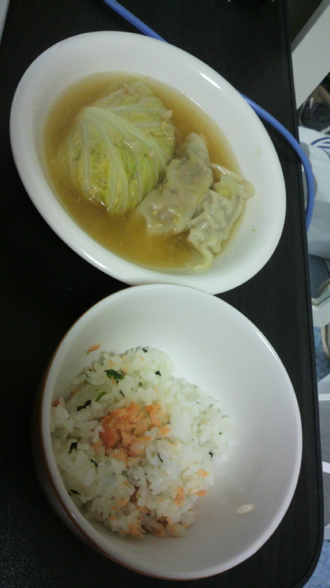 「ごはん少なくね?」とか言われそうですが、冷凍庫に入ってた消費期限切れのおにぎり(セブン)を温めて入れただけなのです。