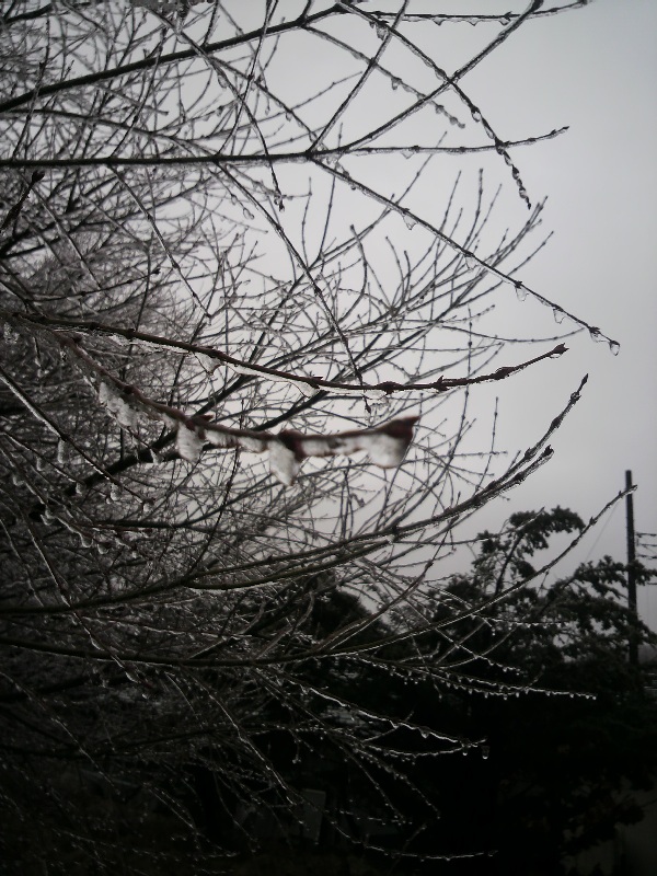 枝についた雨が凍りついてるんです。凄い!