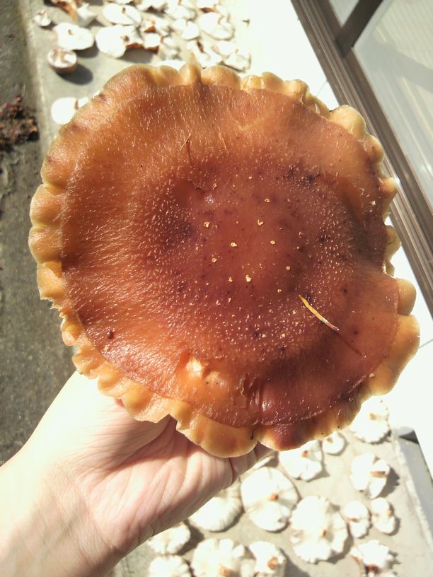 びらびらとしたカサのふちに、テラつく表面。大変見目美しくないキノコですが・・・。