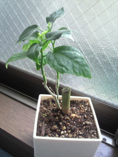 時期的に遅い気もしましたが、通勤中に元気よく花を咲かせてるハイビスカスを見てたらちょっと欲しくなったんです。100円ローソンに入ってたので買っちゃいました←